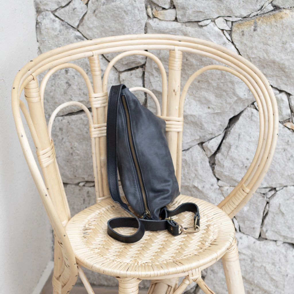 Las riñoneras Roman estan hechas de cuero de curtido vegetal con detalles en tela de cáñamo y algodón orgánico, teñida a mano con tintes naturales.